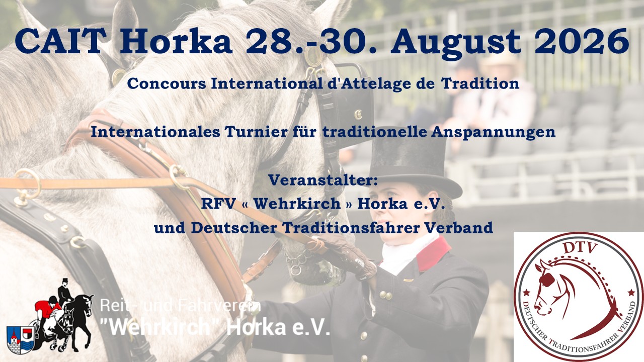 Vom 28. bis 30. August 2026 laden der Reit und Fahrverein „Wehrkirch“ Horka und der Deutsche Traditionsfahrer Verband (DTV) zu einem Turnier für traditionelle Anspannungen in die Oberlausitz.